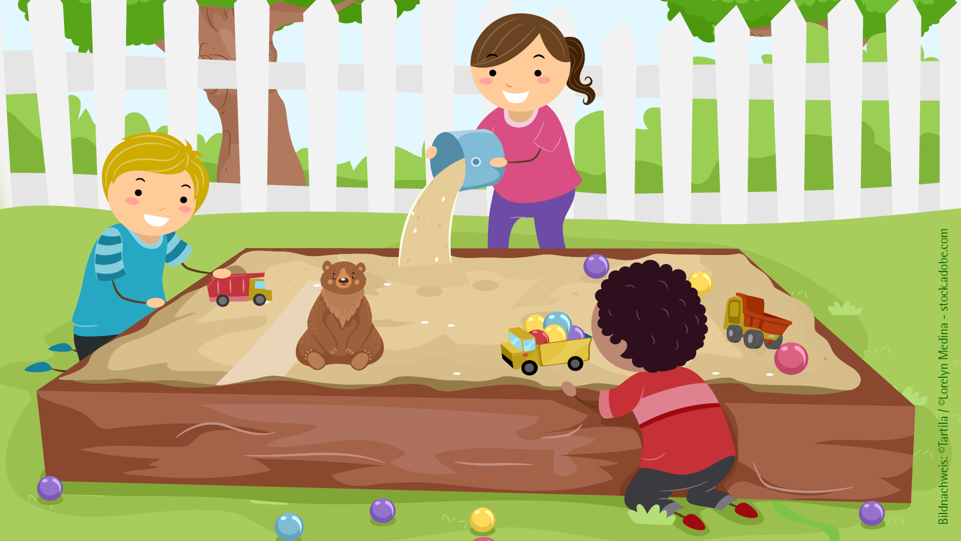 Der Frühling steht vor der Tür. Die Bären sind aus ihrem Winterschlaf erwacht und haben einen Bärenhunger. Auf der Suche nach Futter zeigt sich eine wichtige Eigenschaft der Raubtiere mit dem dicken Pelz. Denn Bären sind gute Gräber: Sie buddeln sich eigene Höhlen oder graben nach Wurzeln. Dabei sind sie erstaunlich geschickt. Zeigt doch mal, wie gut ihr als kleine Bären graben und buddeln könnt! Im Sandkasten haben wir für euch verschiedene Gegenstände versteckt – und auch noch die eine oder andere Überraschung. Mal sehen, was ihr beim Ausbuddeln findet! Auf die Plätze, fertig, los!